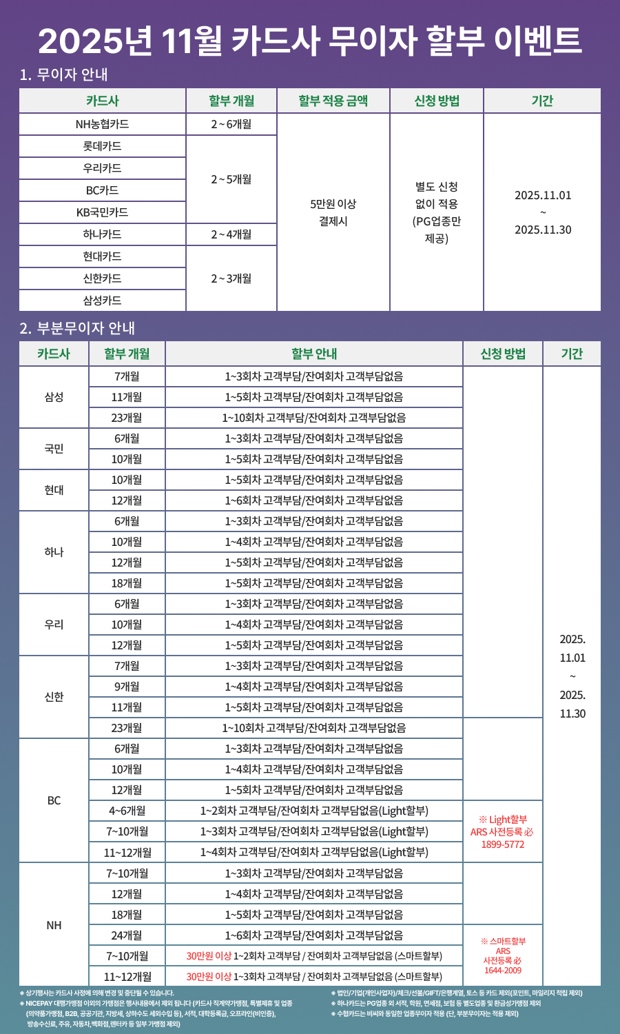 ※ 수협카드: 비씨카드와 동일한 업종 무이자 적용 (부분 무이자는 제외)