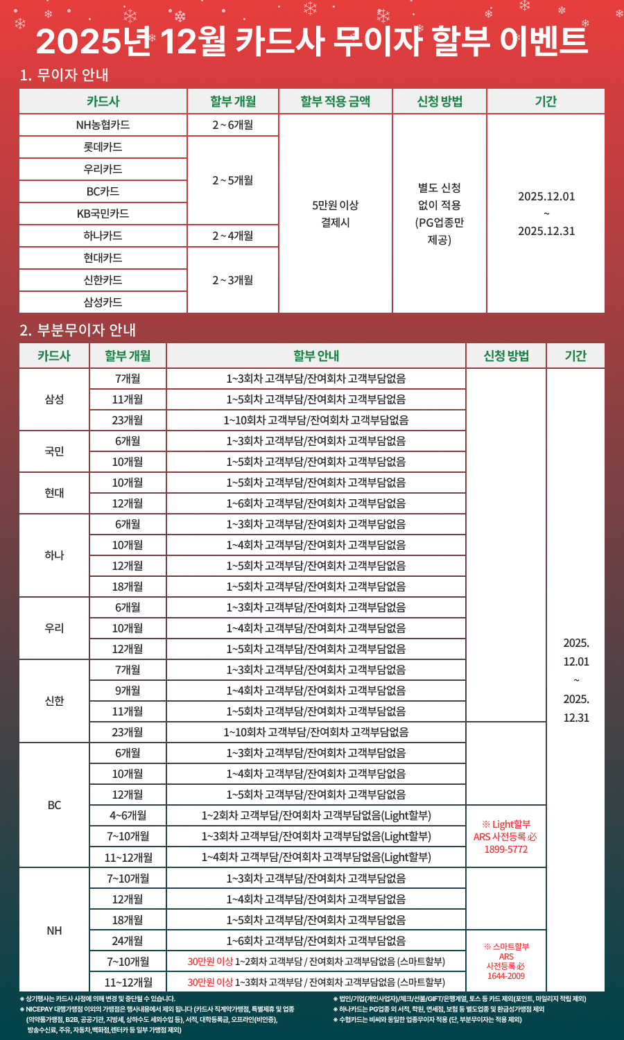 ※ 상기행사는 카드사 사정에 의해 변경 및 중단될 수 있습니다. 자세한 사항은 각 카드사 홈페이지를 참조바랍니다.