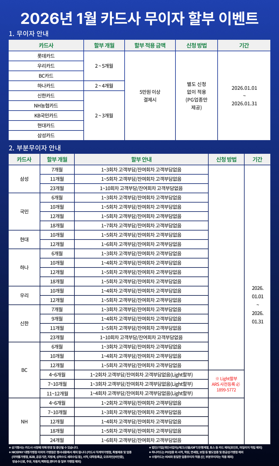 [2026년 1월] 카드사 무이자 할부 안내 ▶ 기간: 2026년 1월 1일~2026년 1월 31일 ▶ 금액: 5만원 이상 ▣ 무이자 할부 안내 1. 하나카드(하나SK/외환): 2~4개월 무이자 2. 비씨카드: 2~5개월 무이자 3. 현대카드: 2~3개월 무이자 4. 신한카드: 2~3개월 무이자 5. KB국민카드: 2~3개월 무이자 6. NH농협카드: 2~3개월 무이자 7. 우리카드: 2~5개월 무이자 8. 롯데카드: 2~5개월 무이자 9. 삼성카드: 2~3개월 무이자 10. 전북카드: 2~3개월 무이자 11. 광주카드: 2~5개월 무이자 12. 수협카드: 2~5개월 무이자 ▣ 부분 무이자 할부 안내 ※ 고객부담 할부 수수료 있으며, 할부 회차별 일부 할부수수료 면제 1. 하나카드 - 6개월: 1~3회차 수수료 고객부담 - 10개월: 1~4회차 수수료 고객부담 - 12개월: 1~5회차 수수료 고객부담 - 18개월: 1~8회차 수수료 고객부담 * 잔여회차 하나카드 부담 2. 국민카드 - 6개월: 1~3회차 수수료 고객부담 - 10개월: 1~5회차 수수료 고객부담 - 12개월: 1~5회차 수수료 고객부담 - 18개월: 1~7회차 수수료 고객부담 * 잔여회차 국민카드 부담 3. 삼성카드 - 7개월: 1~3회차 수수료 고객부담 - 11개월: 1~5회차 수수료 고객부담 - 23개월: 1~10회차 수수료 고객부담 * 잔여회차 삼성카드 부담 4. 신한카드 - 7개월: 1~3회차 수수료 고객부담 - 9개월: 1~4회차 수수료 고객부담 - 11개월: 1~5회차 수수료 고객부담 - 23개월: 1~10회차 수수료 고객부담 * 잔여회차 신한카드 부담 5. BC카드 (※BC카드 부분무이자에서 수협카드는 제외) - 6개월: 1~3회차 수수료 고객부담 - 10개월: 1~4회차 수수료 고객부담 - 12개월: 1~5회차 수수료 고객부담 * 잔여회차 BC카드 부담 ㅇ BC카드 Light 할부 - 4~6개월: 1~2회차 수수료 고객부담 - 7~10개월: 1~3회차 수수료 고객부담 - 11~12개월: 1~4회차 수수료 고객부담 * 잔여회차 BC카드 부담 >이벤트내용: 비씨카드 회원 중 Light 할부 사전신청 고객에 한하여 적용 (※ Non-BC카드 제외) >신청방법: 비씨카드홈페이지, APP, ARS ☎1899-5772 통해 사전등록 필수 6. NH농협카드 - 4~6개월: 1~2회차 수수료 고객부담 - 7~10개월: 1~3회차 수수료 고객부담 - 12개월: 1~4회차 수수료 고객부담 - 18개월: 1~5회차 수수료 고객부담 - 24개월: 1~6회차 수수료 고객부담 * 잔여회차 NH농협카드 부담 7. 우리카드 - 10개월: 1~4회차 수수료 고객부담 - 12개월: 1~5회차 수수료 고객부담 * 잔여회차 우리카드 부담 8. 전북카드 - 4~9개월: 1회차 수수료 고객부담 - 10~12개월: 1~2회차 수수료 고객부담 * 잔여회차 전북카드 부담 9. 현대카드 - 10개월: 1~5회차 수수료 고객부담 - 12개월: 1~6회차 수수료 고객부담 * 잔여회차 현대카드 부담 [유의사항] ※ 상기행사는 카드사 사정에 의해 변경 및 중단될 수 있습니다. 자세한 사항은 각 카드사 홈페이지를 참조바랍니다. ※ 법인/기업(개인사업자)/체크/선불/GIFT/하이브리드/은행계열 카드등 제외 ※ 무이자/부분무이자 적용시, 포인트/마일리지 적립 불가 ※ 상점부담 무이자/특별제휴/직계약가맹점, 오프라인(비인증), 대학등록금, 지방세(세외수입,상수도), 제약(B2B), 주유, 자동차, 승차권, 방송수신료, 보험, 렌터카, 백화점업종, 전기차충전, 홈쇼핑, 병원업종등 제외 ※ 비씨카드 Light할부 ARS 사전 신청 고객의 경우에만 적용 ※ 우리비씨,우리독자카드는 우리카드 무이자 행사 적용(우리비씨 이외 비씨카드는 비씨카드 무이자 행사 적용) ※ 하나카드: PG업종 외 서적,학원,면세점 등 별도업종 및 환금성가맹점, 체육시설, 토스카드 제외 ※ 현대카드: 의약업종, 홈쇼핑 제외 ※ 삼성카드: PG업종 무이자 홈쇼핑, 세금, 병원업종 제외 / 부분무이자 홈쇼핑, 세금, 병원업종, 제약, 유류, 도시가스 제외 ※ 수협카드: 비씨카드와 동일한 업종 무이자 적용(단, 부분무이자는 제외)