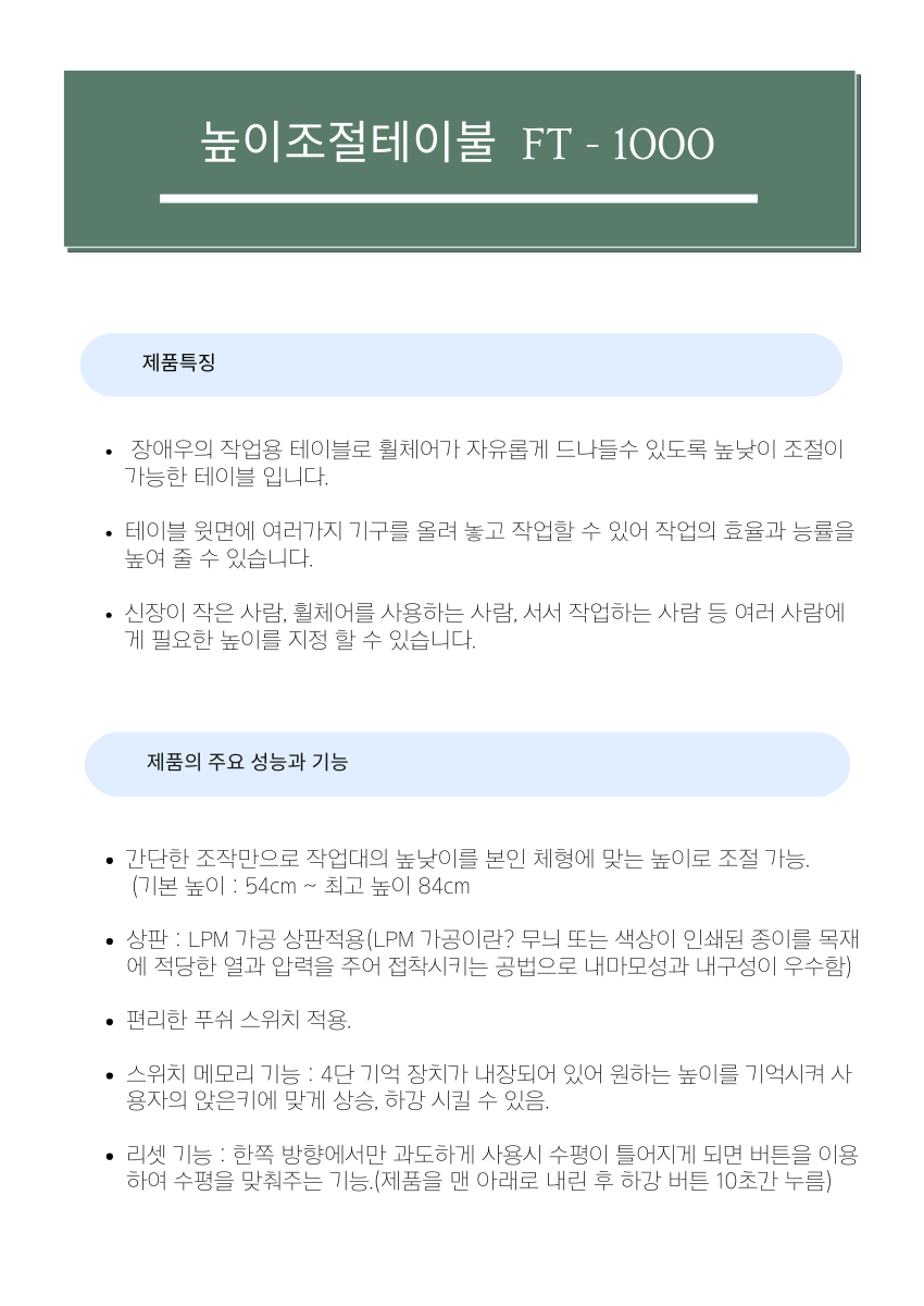 장애인의 작업용 테이블로 휠체어가 자유롭게 드나들 수 있도록 전동으로 높낮이 조절이 가능한 테이블입니다.
