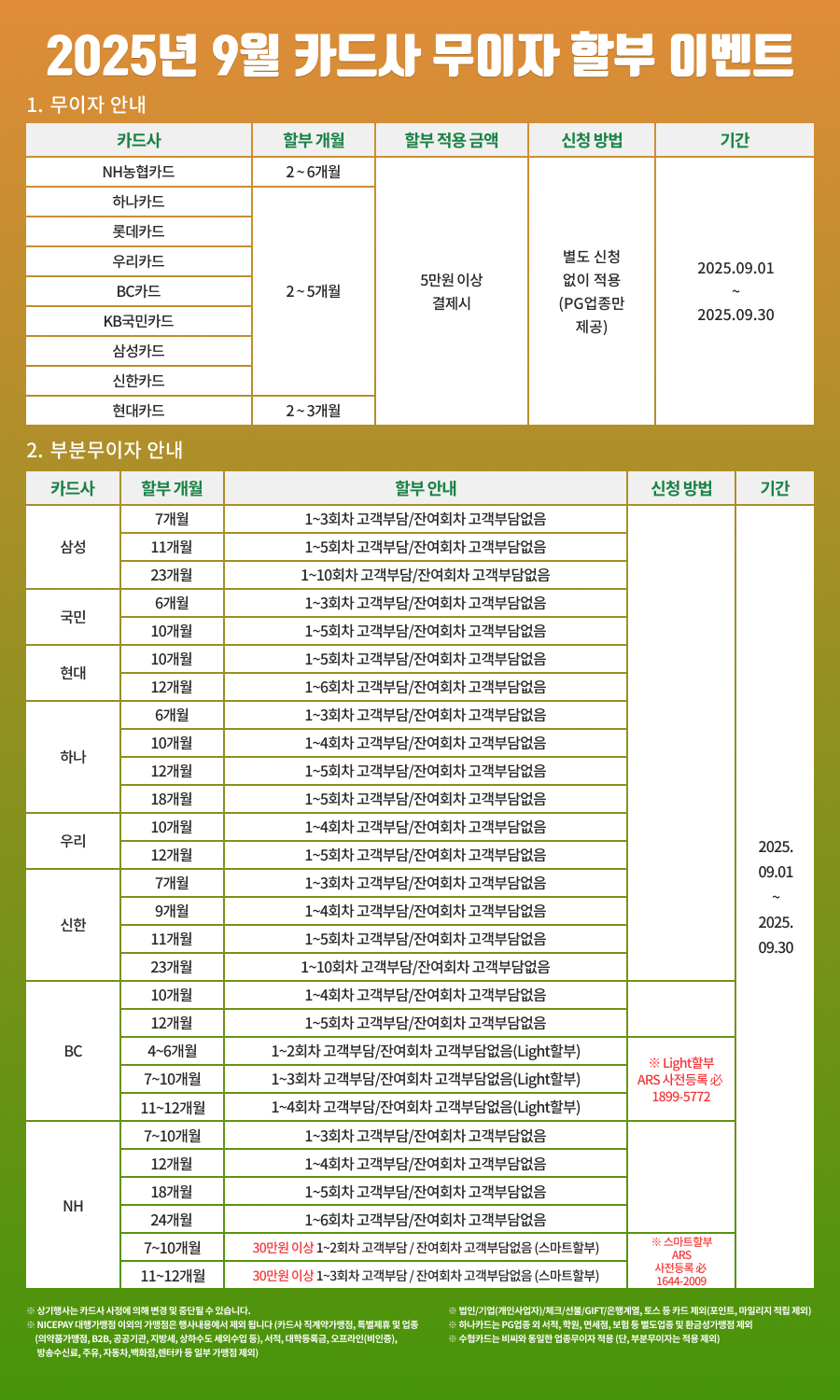 ※ 수협카드: 비씨카드와 동일한 업종 무이자 적용 (부분 무이자는 제외)